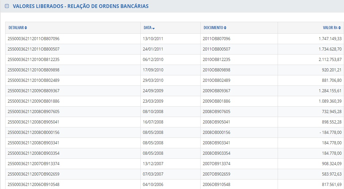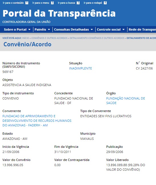 Conforme dados do portal da Transparência, do governo federal, a vigência do convênio teve início em 21 de setembro de 2006 e foi encerrada em 31 de outubro de 2011. Do valor total, R$ 13,89 milhões foram repassados à Faderh, o equivalente a 99,28%, sem contrapartida. O portal também aponta que o contrato com a instituição sem fins lucrativos consta como inadimplente.