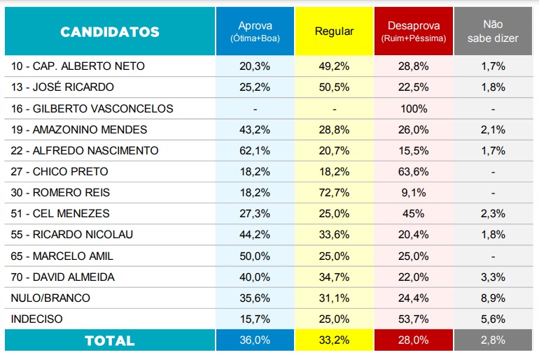 Além disso, a pesquisa aponta que 43,2% dos eleitores de Amazonino Mendes consideram a gestão de Arthur ótima e/ou boa e 62,1% dos eleitores de Alfredo Nascimento consideram a gestão de Arthur ótima e/ou boa.
