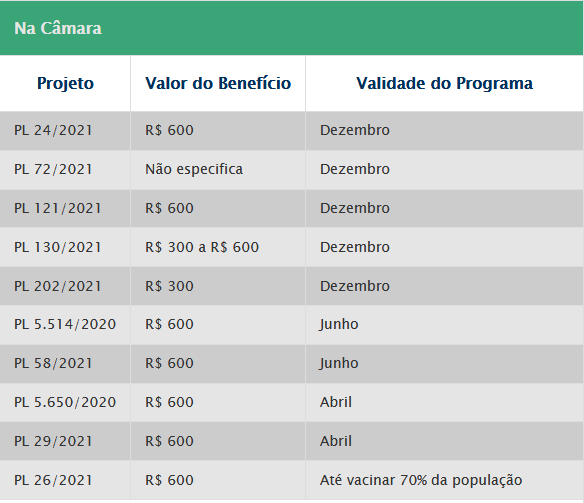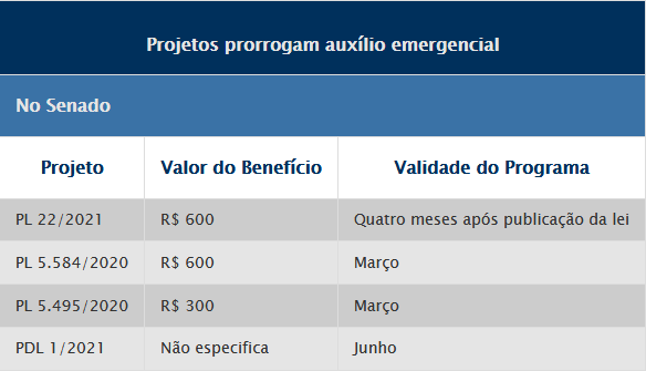 O Senado e a Câmara analisam 14 proposições que pretendem prolongar o auxílio emergencial. São quatro matérias apresentadas por senadores e dez por deputados federais, que sugerem valores e prazos diferentes para a liberação do benefício. O mais recente deles é o Projeto de Lei (PL) 22/2021, do senador Randolfe Rodrigues (Rede-AP). O texto prevê o pagamento de R$ 600 durante quatro meses, com um impacto orçamentário estimado em R$ 138,4 bilhões no período.