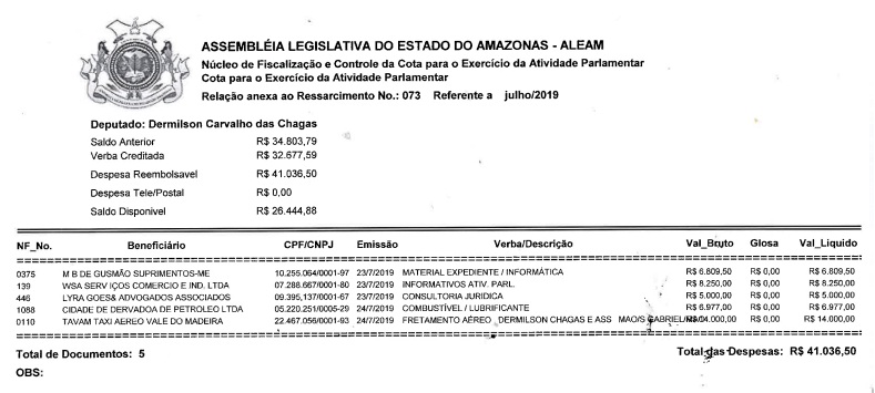 Já o deputado Dermilson Chagas (Podemos), fez uma viagem que custou R$ 14 mil até a cidade de São Gabriel da Cachoeira, por meio da Tavam Táxi Aéreo Vale do Madeira. O parlamentar poderia ter usado as aeronaves que são disponibilizadas pelo Poder Legislativo, entretanto, preferiu gastar o dinheiro do ‘Cotão’ da ALEAM.