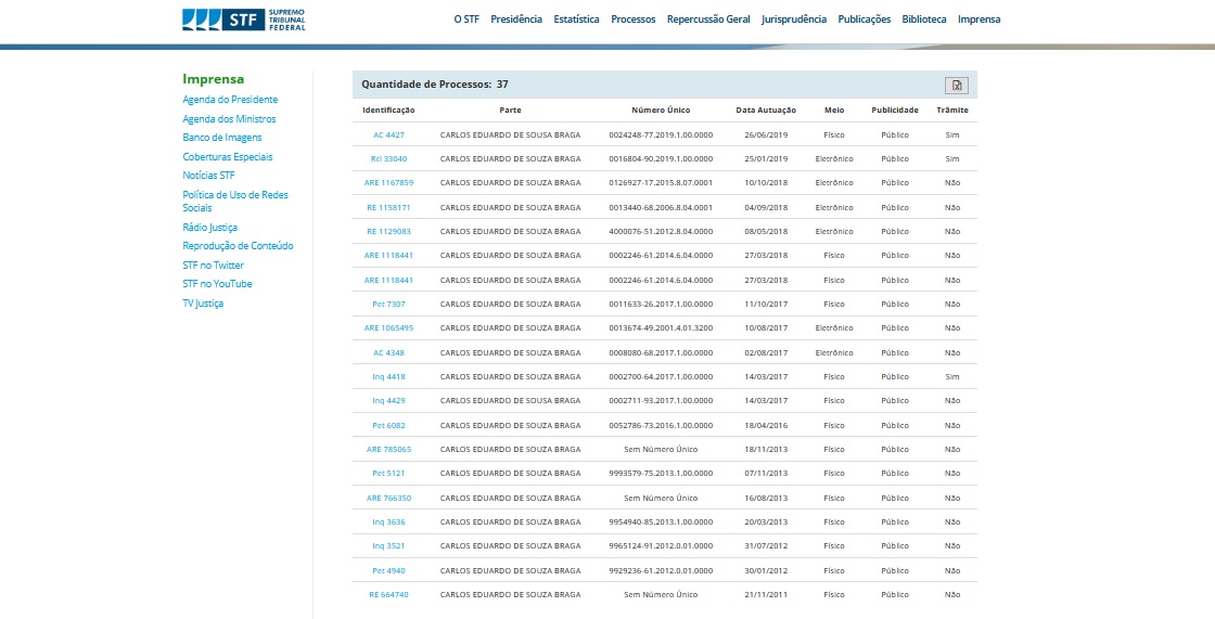 Conforme informações do STF obtidas pelo site O PODER, existem pelo menos 37 processos na instância superior onde aparece o nome de Eduardo Braga. No entanto, em alguns deles o parlamentar é apenas requerente contra outras partes.