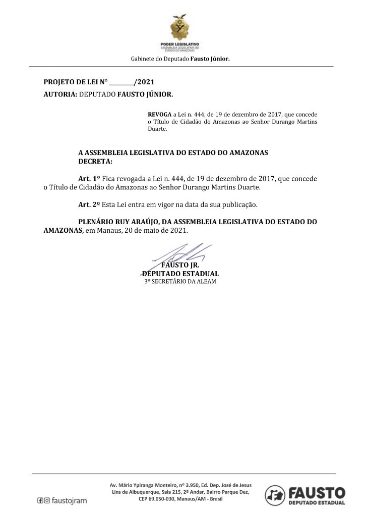 O deputado estadual Fausto Jr. (MDB) apresentou, nesta quinta-feira (20), o Projeto de Lei (PL) que revoga o Título de Cidadão do Amazonas concedido ao empresário Durango Duarte. A proposta vai para votação na Assembleia Legislativa do Amazonas (ALEAM).