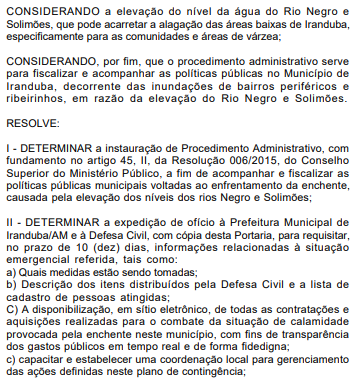 O Ministério Público do Amazonas (MP-AM) instaurou um procedimento administrativo para acompanhar e fiscalizar as políticas públicas voltadas para o enfrentamento da enchente em Iranduba, nas comunidades e áreas de várzea, causada pela elevação dos rios Negro e Solimões. O documento foi publicado no Diário Oficial do órgão, nesta quinta-feira (20).