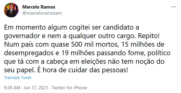 Nesta quarta-feira (16), Marcelo Ramos foi questionado pelos internautas se viria para o cargo de governador de Estado ou presidente da República pelo Partido Liberal. Em resposta aos seguidores, o parlamentar afirmou que esse não é o momento para se pensar em eleições.