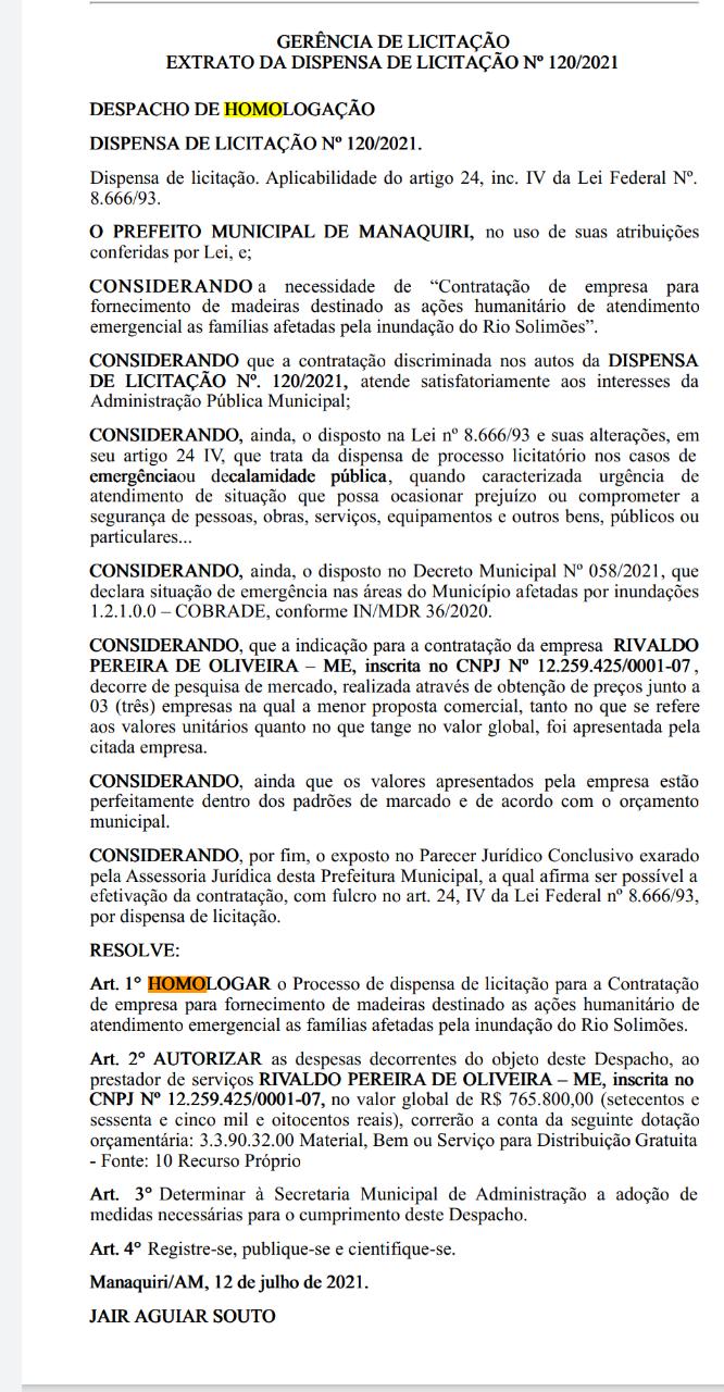 Com dispensa de licitação, o prefeito de Manaquiri, Jair Souto (MDB), contratou uma empresa pelo valor de R$ 750 mil para fornecimento de madeira para a cidade. De acordo com despacho assinado pelo chefe do Executivo Municipal, no dia 12 de julho deste ano, a contratação da empresa Rivaldo Pereira de Oliveira – ME teve como objetivo “ações humanitário (sic) de atendimento emergencial às famílias afetadas pela inundação do Rio Solimões”.