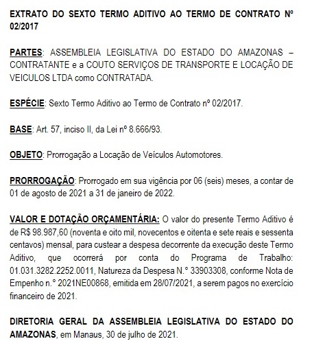 A Assembleia Legislativa do Amazonas (ALEAM) prorrogou os contratos de aluguel de veículos automotores e de micro-ônibus pelo montante de R$ 1.962.675,6, segundo informações do Diário Oficial do Legislativo (DOL).