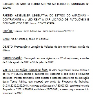 Ainda de acordo com o DOL, em um quinto termo aditivo, a empresa Leo Rent A Car Locação de Automóveis vai receber por mês R$ 114.062,50, ou seja, em 12 meses, a contar de 1º de agosto de 2021 a 31 de julho de 2022, período de vigência do termo aditivo, o Poder Legislativo pagará R$ 1.368.750.