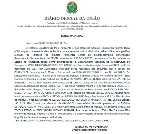 Contrariando o pedido do Ministério Público Federal no Amazonas (MPF-AM) para que não fossem realizadas audiências públicas sobre o Estudo de Impacto Ambiental e Relatório de Impacto Ambiental (EIA/Rima) da reconstrução e pavimentação da rodovia BR-319 (Manaus-Porto Velho), entre os quilômetros 250 a 655, conhecido como ‘Trecho do Meio’, o Instituto Brasileiro do Meio Ambiente e dos Recursos Naturais Renováveis (Ibama) e o Departamento Nacional de Infraestrutura de Transportes no Amazonas (Dnit-AM) irão promover as reuniões na capital do Estado e nos municípios Careiro Castanho, Manicoré e Humaitá.