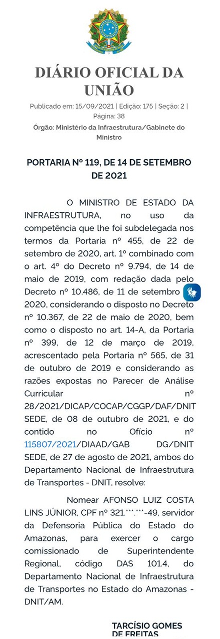Na publicação, assinada pelo ministro da Infraestrutura, Tarcísio Gomes de Freitas e divulgada no Diário Oficial da União (DOU), consta que ele está sendo cedido pela Defensoria Pública do Amazonas (DPE-AM) para exercer a função.