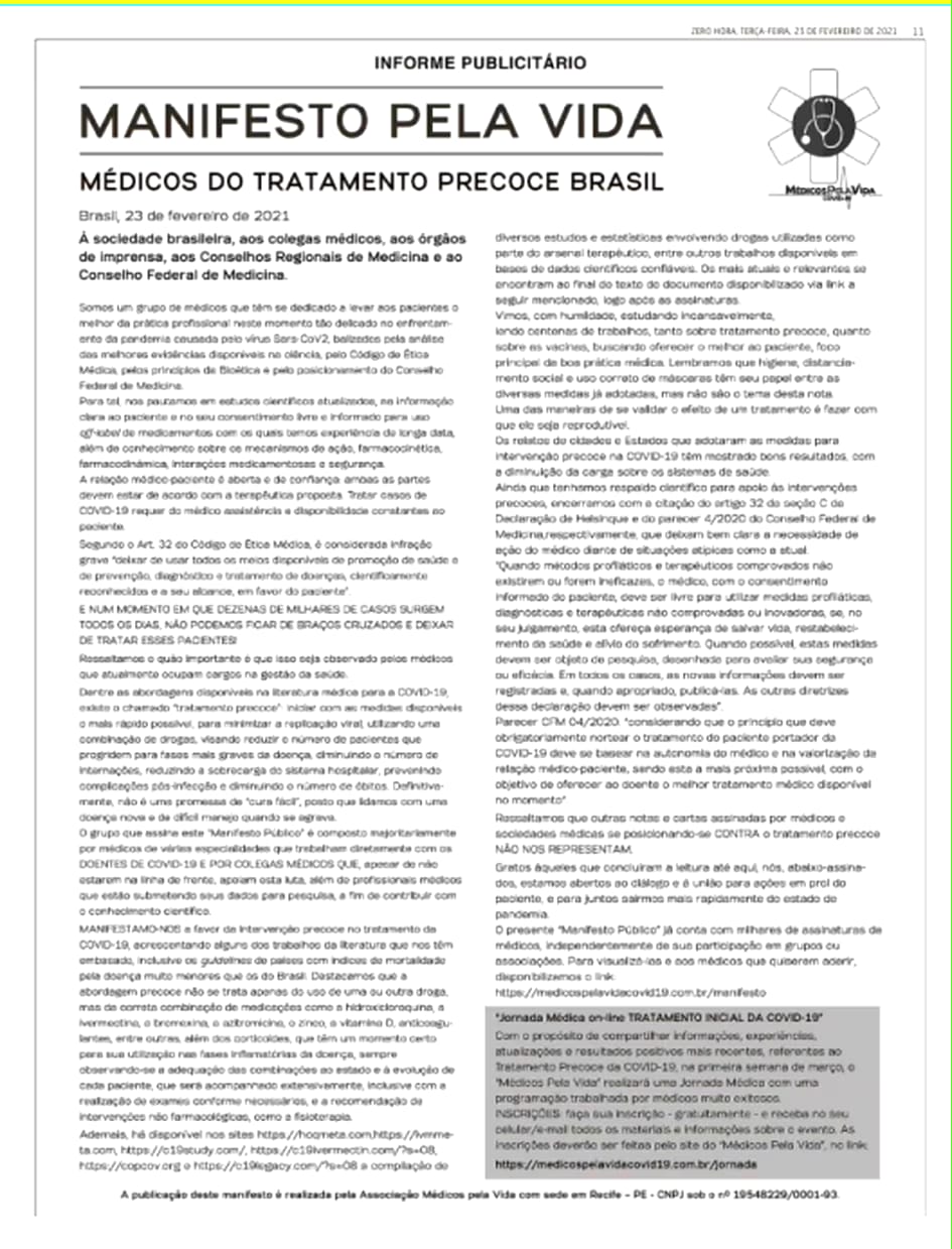 A Justiça Federal no Rio Grande do Sul condenou os responsáveis pelo ‘Manifesto Pela Vida’ – material publicitário que estimulava o ‘tratamento precoce’ da covid-19 – ao pagamento de R$ 55 milhões por danos danos morais coletivos e à saúde.
