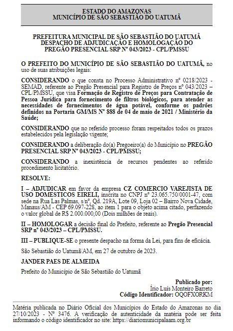 A Prefeitura de São Sebastião do Uatumã (AM) vai adquirir filtros biológicos para água potável por R$ 2 milhões. O contrato foi homologado pelo prefeito Jander Barreto (Republicanos) e a licitação correspondente foi publicada no Diário Oficial dos Municípios do Amazonas do dia 27 de outubro. A CZ Comércio Varejista de Uso Doméstico Eirelli, também fornecedora dos mesmos itens para o município de Barreirinha, em contratos que totalizaram até R$2,4 milhões, é a empresa escolhida para fornecer os filtros.
