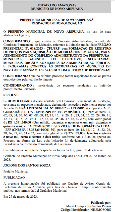A Prefeitura Municipal de Novo Aripuanã, no Amazonas, oficializou a homologação de dois contratos: um no valor de R$ 1.291.240,00 (um milhão, duzentos e noventa e um mil, duzentos e quarenta reais) e outro no valor de R$ 279.172,00 (duzentos e setenta e nove mil, cento e setenta e dois reais), relativos à aquisição de mobiliários em geral. A contratação considerou o pregão presencial n° 018/2023 e foi assinada pelo prefeito do município, Jocione Souza (PSDB). O documento foi publicado no Diário Oficial dos Municípios do Amazonas, do dia 27 de outubro.