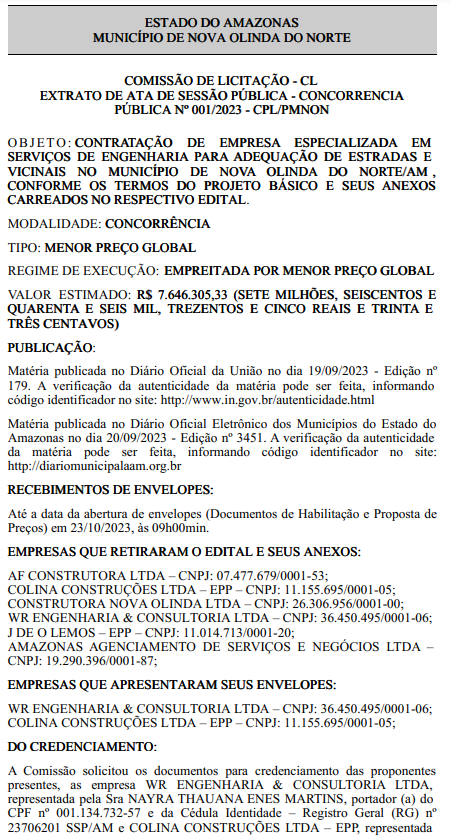 A Prefeitura de Nova Olinda do Norte (AM) destacou R$ 7.646.305,33 para a adequação de estradas e vicinais do município. A modalidade da licitação foi a concorrência, e a empresa “WR Engenharia & Consultoria Ltda” foi declarada habilitada após a análise dos documentos de habilitação. O extrato da ata de sessão pública foi publicado no Diário Oficial dos Municípios do Amazonas em 01/11.