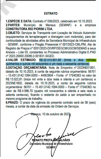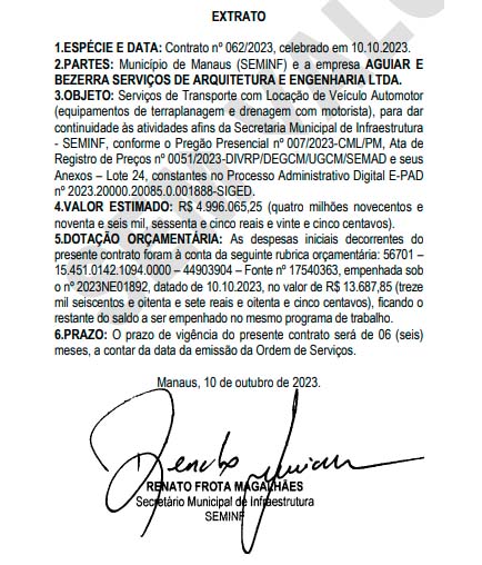 Três extratos foram publicados no Diário Oficial do Município de Manaus (DOM), na edição de terça-feira (14) . A empresa Construtora Rio Piorini LTDA foi registrada para obra com valor de R$ 32.515.601,60 (trinta e dois milhões, quinhentos e quinze mil, seiscentos e um reais e sessenta centavos). Em outro extrato, figura a empresa Mabole Construções e Comércio LTDA, cuja ação foi registrada com valor de R$ 11.616.271,00 (onze milhões, seiscentos e dezesseis mil, duzentos e setenta e um reais). Outra empresa apontada é a Aguiar e Bezerra Serviços de Arquitetura e Engenharia LTDA, com valor estimado de R$ 4.996.065,25 (quatro milhões, novecentos e noventa e seis mil, sessenta e cinco reais e vinte e cinco centavos).
