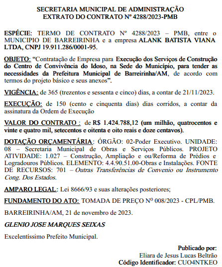 A Prefeitura de Barreirinha (AM) assinou um contrato, no valor de R$1.424.788,12 (um milhão, quatrocentos e vinte e quatro mil, setecentos e oitenta e oito reais e doze centavos), para a construção do Centro de Convivência do Idoso, projeto destinado a atender às crescentes demandas da população idosa e local. A informação foi publicada no Diário Oficial dos Municípios desta quinta-feira (23). O documento, homologado pelo prefeito Glênio Seixas (MDB) ainda destaca a empresa Alank Batista Viana Ltda, com nome fantasia Coman Construtora, como vencedora do processo de tomada de preços.