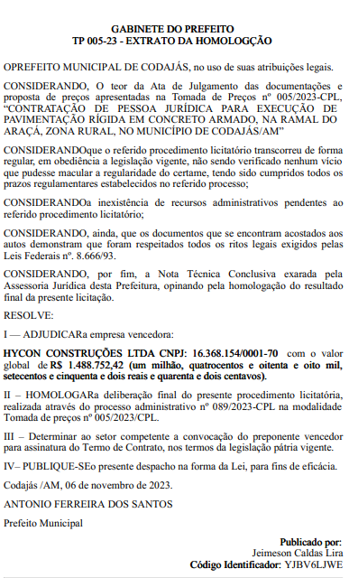 O prefeito de Codajás, Antonio Ferreira dos Santos (Progressistas), homologou um contrato para a pavimentação rígida em concreto armado no ramal do Araçá, zona rural do município, por R$ 1.488.752,42 (um milhão, quatrocentos e oitenta e oito mil, setecentos e cinquenta e dois reais e quarenta e dois centavos). A licitação referente à contratação foi publicada no Diário Oficial dos Municípios do Amazonas desta sexta-feira (24). A empres Hycon Construções Ltda, sediada em Manaus, foi a vencedora da tomada de preços nº 005/2023-CPL.