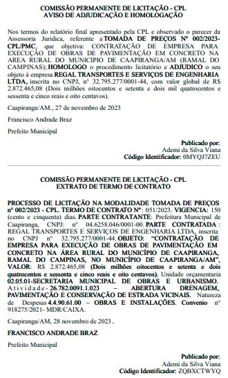 Conforme o documento, o ato público objetiva a contratação de uma empresa para “execução de obras de pavimentação em concreto na área rural do município (ramal do Campinas)”. A empresa escolhida para os trabalhos é a Regal Transportes e Serviços de Engenharia, inscrita no Cadastro Nacional de Pessoa Jurídica (CNPJ) de número 32.795.277/0001-44.