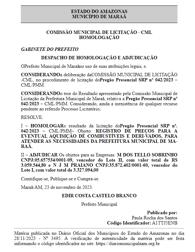 A Prefeitura de Maraã (AM) homologou uma licitação no valor total de R$ 6.386.638,8 (seis milhões, trezentos e oitenta e seis mil, seiscentos e trinta e oito reais e oitenta centavos) destinada à aquisição de combustíveis e derivados. O contrato, oriundo do pregão presencial SRP nº 042/2023 – CML/PMM, conduzido pela Comissão Municipal de Licitação (CML), foi formalizado pelo prefeito Pr. Edir Castelo Branco (Republicanos) e divulgado no Diário Oficial dos Municípios do Estado do Amazonas nesta terça-feira (28).