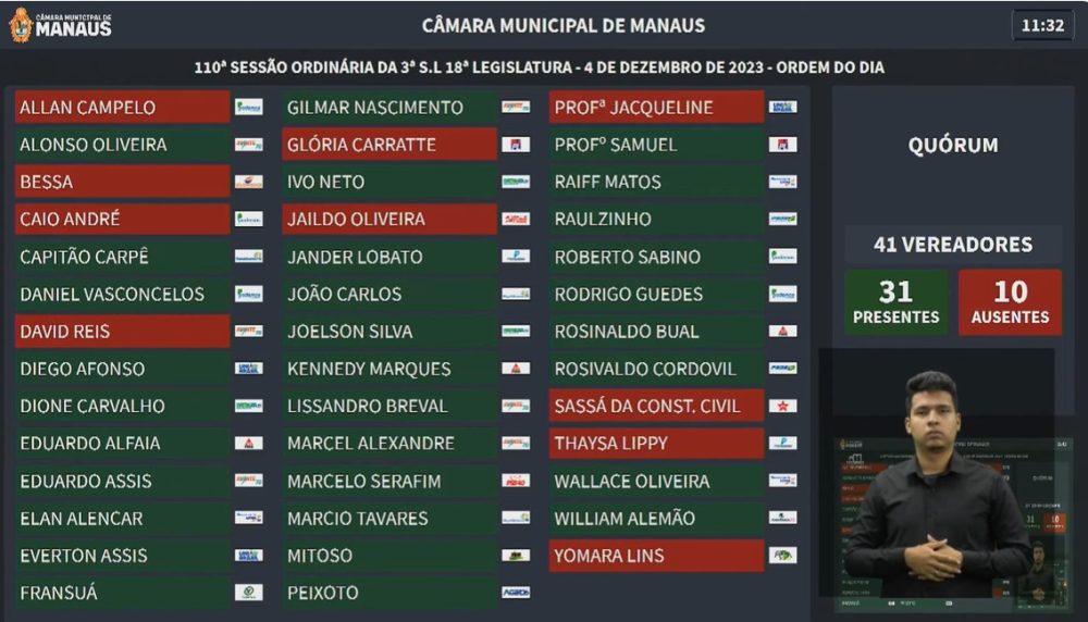 Um registro do painel eletrônico, por volta das 11h30, mostra a ausência de 10 vereadores no plenário da Casa Legislativa, onde a diferença entre o grupo do prefeito e o grupo da presidência é de apenas 1 ou 2 votos nas votações.