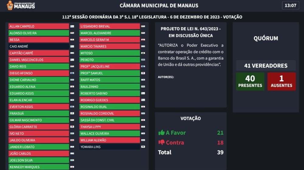 “Eu me quedo ao entendimento da Procuradoria, haja vista que o Banco do Brasil informou que eles são uma entidade de natureza jurídica privada, mas que trata-se de um ente público. Nosso Regimento Interno e a Lei Orgânica do Município de Manaus (Loman) dizem que os entes públicos serão tratados, de acordo com o artigo 23, por maioria simples. Somente seria maioria absoluta se fosse uma entidade privada”, acrescentou Caio André.