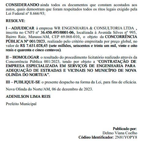 A empresa escolhida no ato público foi a WR Engenharia & Consultoria, cujo Cadastro Nacional de Pessoa Jurídica (CNPJ) é de número 36.450.495/001-06. A companhia, localizada no bairro Raiz, zona sul de Manaus, tem como principal atividade econômica as obras de serviços de engenharia, conforme site do governo federal.