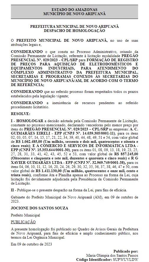 A Prefeitura de Novo Aripuanã (AM) homologou três licitações no valor total de R$ 3.330.860 (três milhões, trezentos e trinta mil reais e oitocentos e sessenta reais) para a aquisição de eletrodomésticos e equipamentos industriais destinados ao Complexo Administrativo da Prefeitura Municipal, secretarias e programas afiliados. Os contratos foram oficialmente firmados pelo prefeito do município, Jocione Souza (PDT), e foram publicados no Diário Oficial dos Municípios do Amazonas, nesta quinta-feira (07).