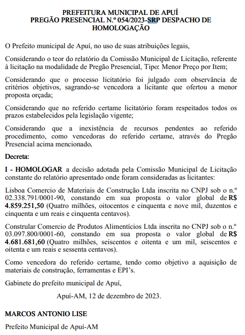 A Prefeitura de Apuí (AM) homologou uma licitação no valor global de R$9.540.933,10 (nove milhões, quinhentos e quarenta mil, novecentos e trinta e três reais e dez centavos) para a aquisição de materiais de construção, ferramentas e equipamentos de proteção individual (EPI’s). O processo, que deu mérito a duas empresas, foi assinado pelo prefeito do município Marcos Lise (PSC) e a informação foi publicada no Diário Oficial dos Municípios do Amazonas, desta terça-feira (12).