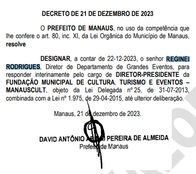 O prefeito David Almeida (Avante) exonerou Osvaldo Cardoso Neto do cargo de presidente da Fundação Municipal de Cultura, Eventos e Turismo (ManausCult). A informação foi publicada na edição de quinta-feira (21) do Diário Oficial do Município de Manaus. Nessa mesma edição, o anúncio da nomeação de Reginei Rodrigues como presidente do órgão se destacou. Conhecido por seu papel de diretor de grandes eventos na ManausCult, Rodrigues agora ocupa o cargo interinamente.