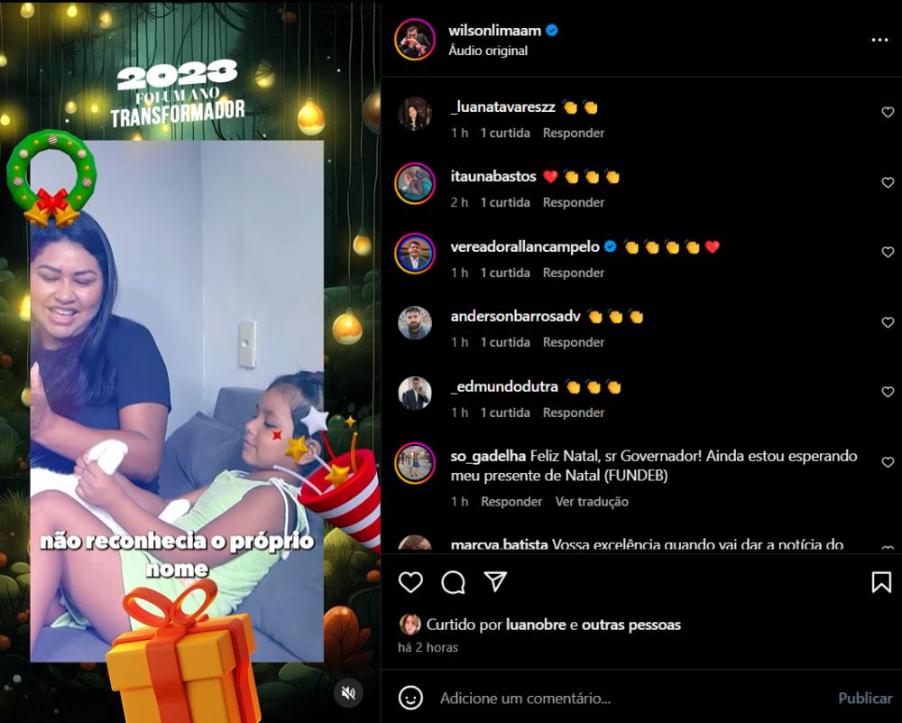 Neste Natal, políticos do Amazonas usaram as redes sociais para destacar as ações do ano e se conectar com eleitores. Vídeos e mensagens de Natal dominaram as telas, neste fim de semana. O governador Wilson Lima (UB) mencionou, em uma postagem, os benefícios do Passe Livre Estudantil para estudantes de Manaus.