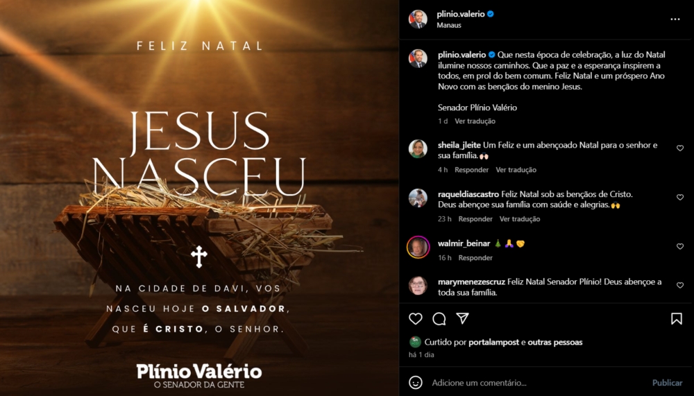 Os senadores Eduardo Braga (MDB) e Plínio Valério (PDSB) foram os únicos que haviam compartilhado mensagens natalinas. Braga refletiu sobre as dificuldades enfrentadas pelo povo do Amazonas em 2023. “Foi um ano tão difícil, que até os nossos rios quase deixaram de correr. Mas o nosso povo seguiu remando, sempre com muito trabalho e fé. Junto com o retorno das águas, agora é o momento do nascimento de uma nova esperança”, mencionou.