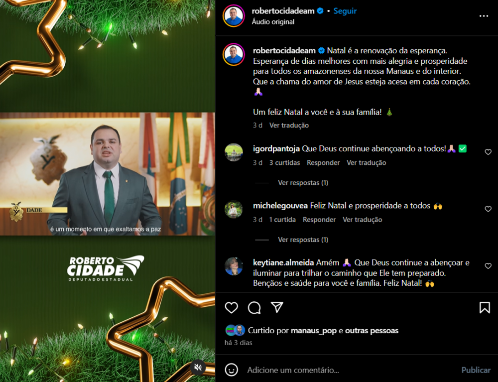 O deputado estadual e presidente da Assembleia Legislativa do Amazonas (Aleam), Roberto Cidade (UB), também se manifestou com um vídeo, desejando um Feliz Natal e destacando a esperança de “dias melhores com mais alegria e prosperidade para todos os amazonenses da nossa Manaus e do interior. Que a chama do amor de Jesus esteja acesa em cada coração”.