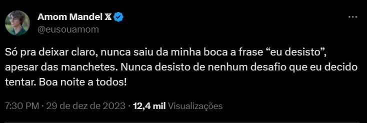 O deputado federal Amom Mandel (Cidadania) voltou a repercutir na plataforma X (antigo Twitter) as declarações feitas em um vídeo publicado, por ele mesmo, na noite desta sexta-feira (29) sobre se candidatar ao cargo de chefe do executivo municipal no pleito 2024. Mandel lançou “só pra deixar claro, nunca saiu da minha boca a frase “eu desisto”, apesar das manchetes. Nunca desisto de nenhum desafio que eu decido tentar. Boa noite a todos!”, em resposta às manchetes que abordaram a desistência do parlamentar que figura em segundo lugar no ranking de intenções de voto.