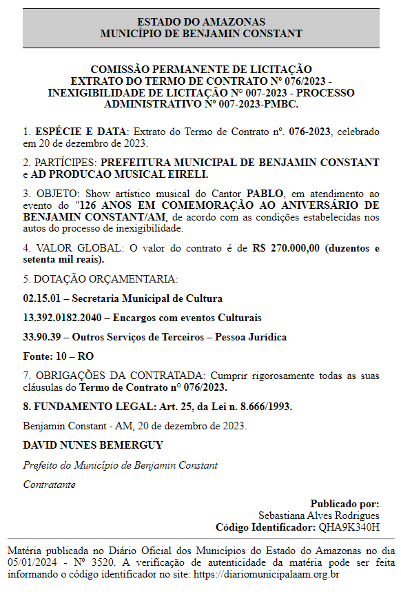O prefeito do município de Benjamin Constant, David Bemerguy (MDB), contratou o cantor Pablo para uma apresentação musical. O show, que marca a comemoração dos 126 anos da cidade, foi agendado mediante um contrato de R$270 mil (duzentos e setenta mil reais), concedido sem processo de licitação. A assinatura foi formalizada em 20 de dezembro de 2023, com os detalhes sendo publicados no Diário Oficial dos Municípios do Amazonas em 05 de janeiro.