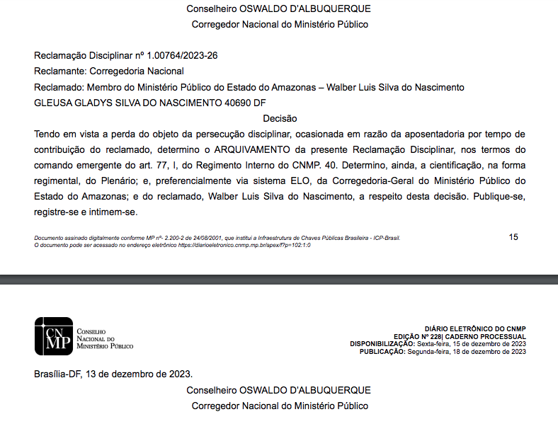 De acordo com a manifestação do corregedor nacional do MP, Oswaldo D’Albuquerque, devido à aposentadoria por tempo de contribuição de Walber Nascimento que estava sendo investigado, a causa da investigação tornou-se sem efeito.