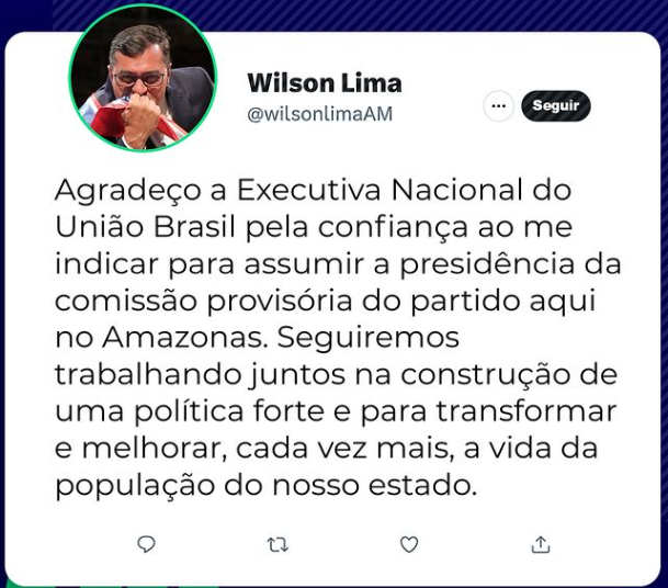 Lima divulgou a informação em suas redes sociais nesta terça-feira (09). Em sua publicação, o governador expressou sua gratidão à liderança nacional do partido por confiar nele para liderar a comissão temporária no Amazonas. Ele também enfatizou seu compromisso de colaborar para fortalecer a política e melhorar a vida dos cidadãos do estado.