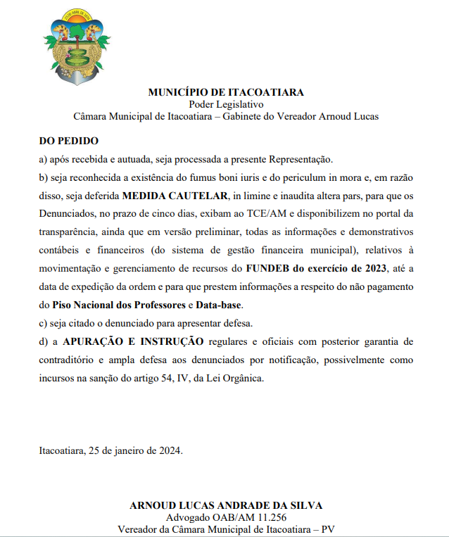 O vereador Arnoud Lucas (PV) denunciou ao Tribunal de Contas do Estado do Amazonas (TCE-AM), nesta quinta-feira (25), irregularidades na gestão dos recursos destinados ao Fundo de Manutenção e Desenvolvimento da Educação Básica (Fundeb) em Itacoatiara (AM). O parlamentar requereu medidas cautelares e esclarecimentos sobre a não destinação dos recursos aos servidores da educação.