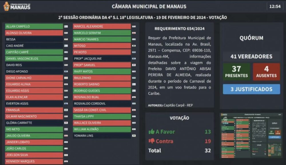 Na sessão desta segunda-feira (19/02), a Câmara Municipal de Manaus (CMM) testemunhou um embate intenso em torno da solicitação de explicações sobre a polêmica viagem de jatinho de luxo ao Caribe realizada pelo prefeito David Almeida (Avante) durante o feriado de Carnaval. No entanto, os requerimentos apresentados pelos vereadores Rodrigo Guedes (Podemos) e Capitão Carpê (Republicanos), que buscavam esclarecimentos sobre o assunto, foram rejeitados pela maioria dos vereadores presentes.
