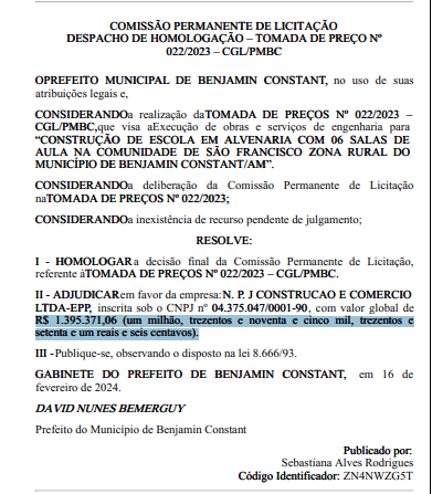 De acordo com o despacho assinado pelo prefeito David Nunes Bemerguy, o objetivo do projeto é “a construção de uma escola em alvenaria, composta por seis salas de aula, na comunidade de São Francisco, zona rural de Benjamin Constant”.