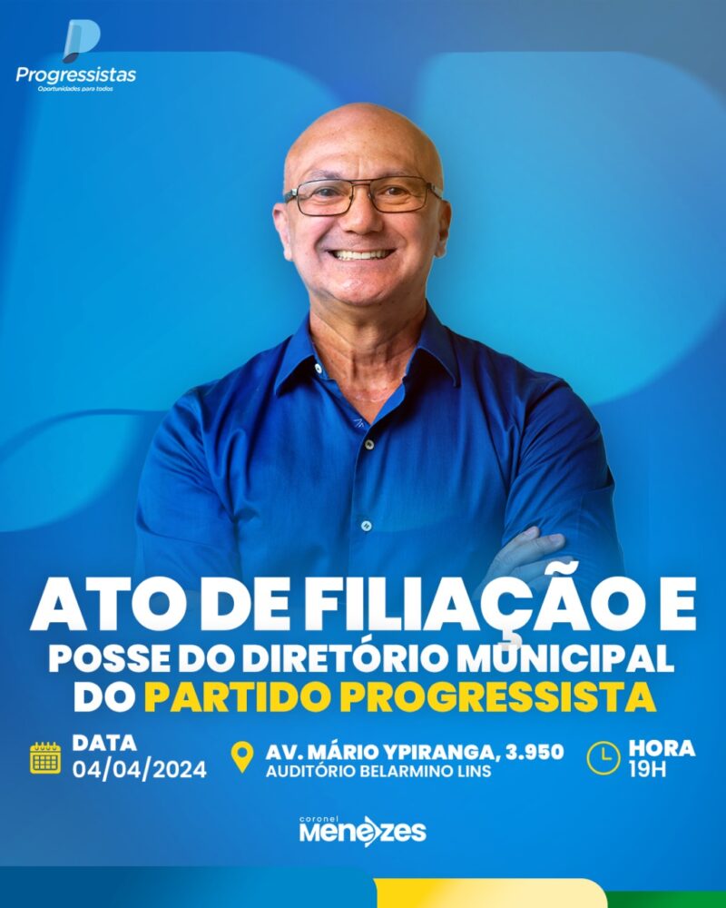 Na noite desta segunda-feira (1/4), o Coronel Menezes anunciou em suas redes sociais sua filiação ao Progressistas e sua posse como presidente do diretório municipal do partido. O evento está marcado para a noite da próxima quinta-feira (4/4) e está gerando expectativas. O Progressistas faz parte do arco de alianças do governador Wilson Lima e é comandado por Rodrigo de Sá, diretor-presidente do Detran-AM.