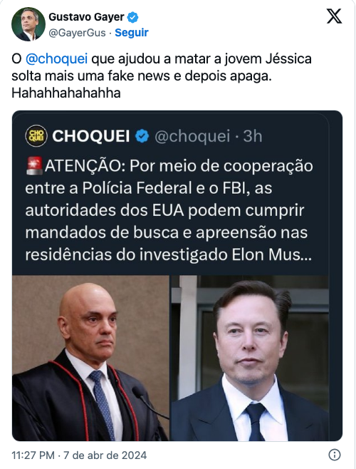 Os deputados federais Gustavo Gayer (PL-GO) e Júlia Zanatta (PL-SC) denunciaram a página de fofocas Choquei por disseminação de notícias falsas, alegando que o perfil no Twitter/X publicou informações inverídicas sobre uma suposta operação do FBI, a principal agência de investigação dos Estados Unidos, em conjunto com a Polícia Federal brasileira nas residências de Elon Musk. A publicação, feita às 20h46 do último domingo, afirmava que mandados de busca e apreensão teriam sido executados, uma informação rapidamente removida pela página após a divulgação.