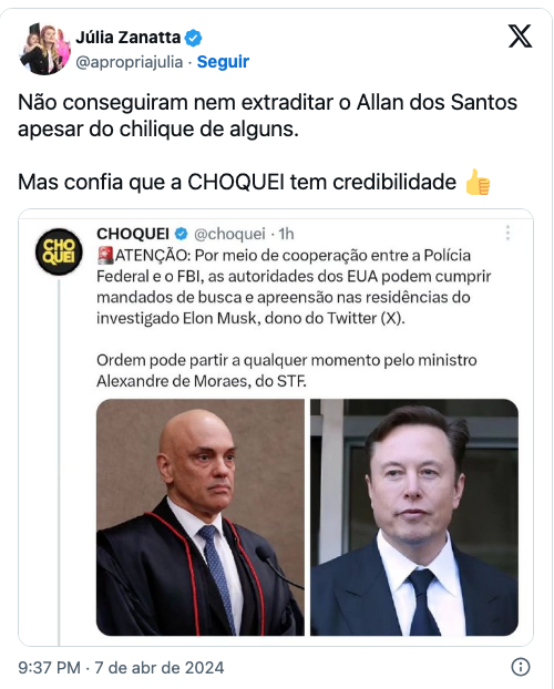 Júlia Zanatta, por sua vez, utilizou a situação para ironizar a eficácia das solicitações do ministro Alexandre de Moraes, do Supremo Tribunal Federal (STF), ao governo dos Estados Unidos, comparando a falta de resposta no caso de Allan dos Santos, jornalista exilado há três anos, e a improbabilidade de uma ação contra Elon Musk, cidadão sul-africano naturalizado norte-americano desde 2002 e uma das figuras mais ricas e influentes globalmente.
