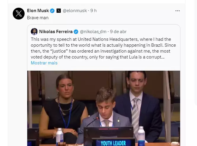 Ao repostar o vídeo do brasileiro, Musk chamou Nikolas de “corajoso”.