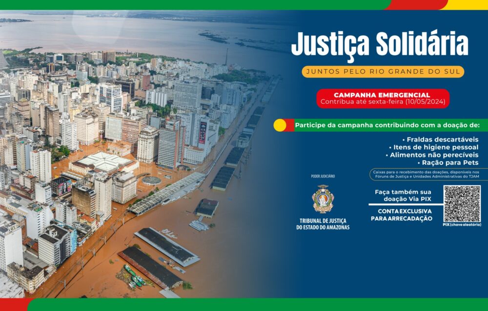 O Tribunal de Justiça do Amazonas (TJAM) lançou a campanha emergencial “Justiça Solidária” mobilizando servidores, magistrados, estagiários, colaboradores e a sociedade em geral para a arrecadação de mantimentos e demais itens de primeira necessidade em prol da população do Rio Grande do Sul, gravemente afetada pelas enchentes dos rios da região.