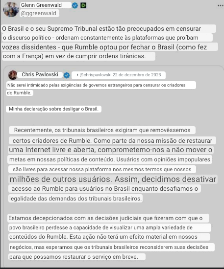 O CEO da Rumble, Chris Pavlovski, recusou-se a cumprir as exigências de Moraes, bloqueando o acesso à plataforma no Brasil. Moraes também ameaçou suspender a plataforma X no Brasil, exigindo o banimento de contas sem notificar os usuários que estavam sob investigação. Musk desafiou a ordem judicial e recusou-se a banir as contas conforme solicitado por Moraes.
