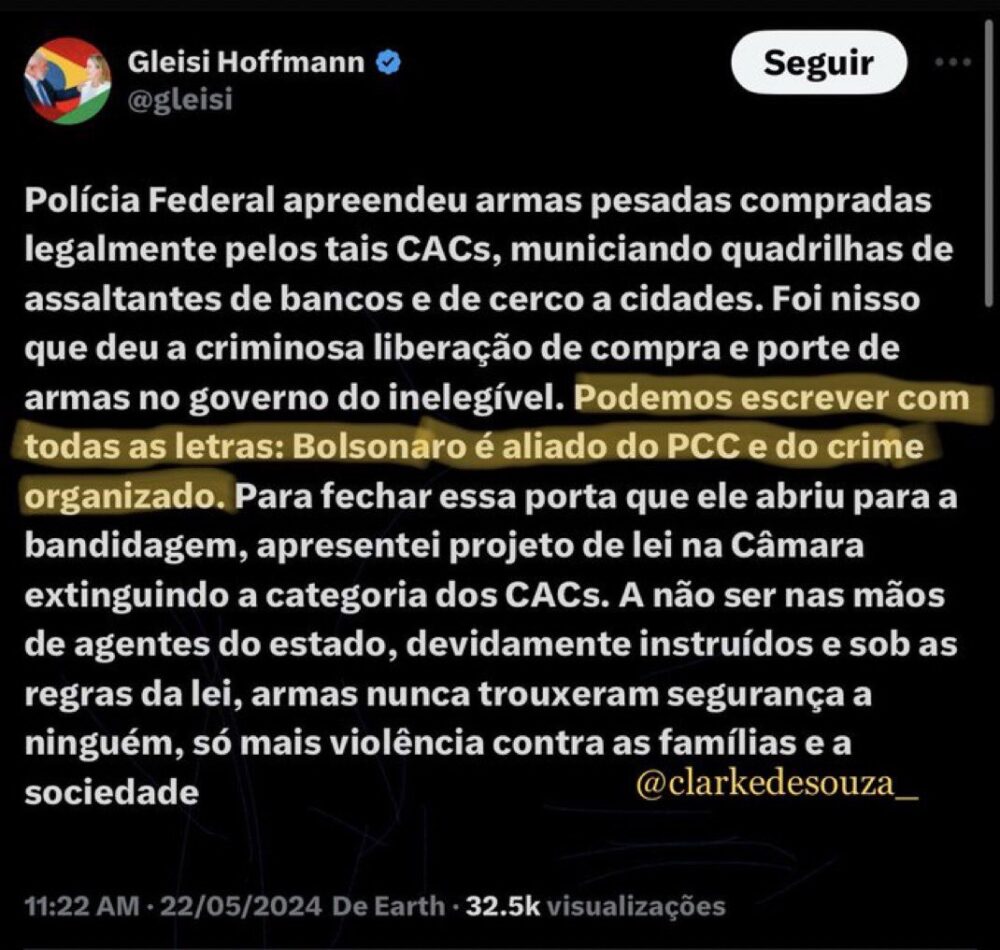 Gleisi argumentou que Bolsonaro, durante seu mandato, teria negligenciado a segurança pública e permitido que o crime organizado se espalhasse pelo país. Ela citou o aumento de crimes violentos e a presença crescente de facções criminosas em cidades brasileiras como evidência de que o ex-presidente teria fechado os olhos para as atividades do PCC.