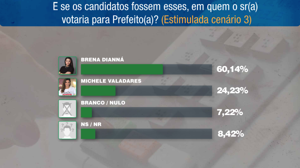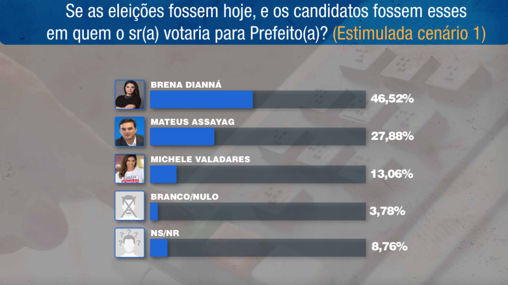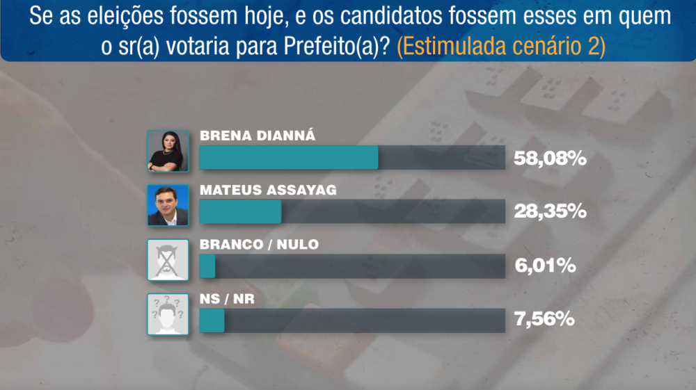 No cenário 2, quando perguntado aos eleitores, se a eleição fosse hoje e em quem votariam, sendo que os candidatos apresentados eram apenas Brena Dianná e Mateus Assayag, a vereadora sobe ainda mais nas intenções de votos, atingindo 58,08% contra 28,35% obtidos pelo vereador.