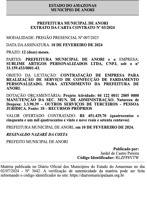 A Prefeitura de Anori, no interior do Amazonas, vai gastar R$ 451.429,70 na confecção de fardamento personalizado para seus servidores municipais. De acordo com o extrato da carta contrato nº 03/2024, publicado no Diário Oficial dos Municípios do Amazonas (DOMA) nesta terça-feira (2/7), a empresa contratada é a Sublime Artigos Personalizados Ltda. O contrato foi assinado pelo prefeito Reginaldo Nazaré da Costa (Republicanos).