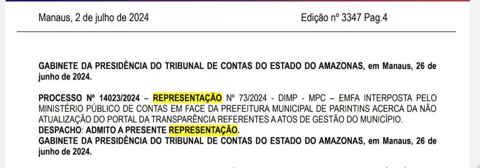 A pedido do Ministério Público de Contas, o Tribunal de Contas do Amazonas (TCE-AM) aceitou nesta segunda-feira (2/7), uma representação contra a Prefeitura de Parintins, liderada por Bi Garcia (PSD), para exigir a atualização do Portal de Transparência da cidade.