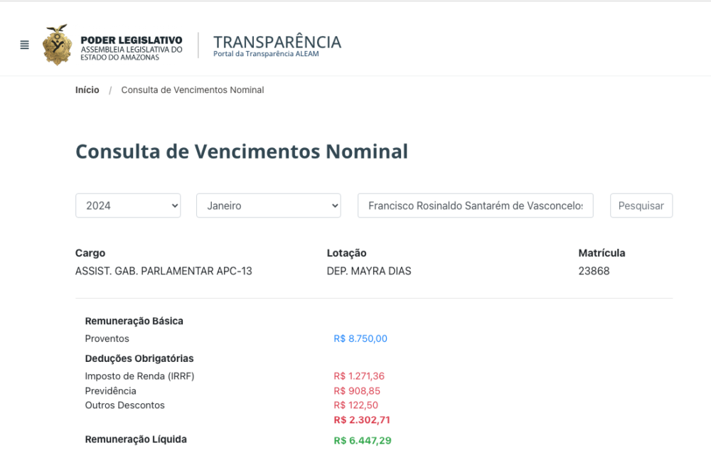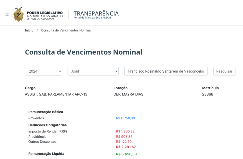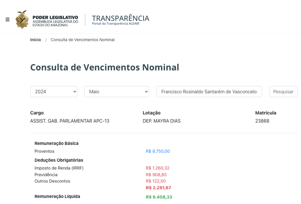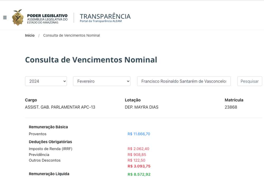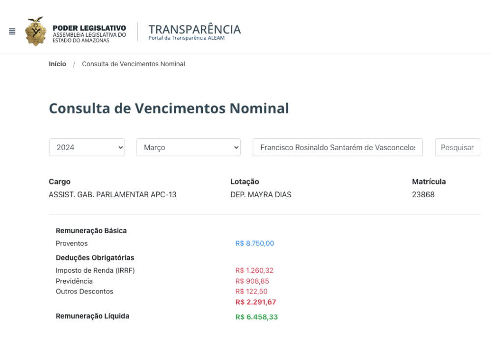 Cearazinho, que mora em Parintins, está registrado como Assistente de Gabinete Parlamentar APC-13 na Assembleia Legislativa do Estado do Amazonas (ALEAM) com um salário de R$ 8,7 mil, sendo que em fevereiro a remuneração básica registrada é R$ 11,6 mil.