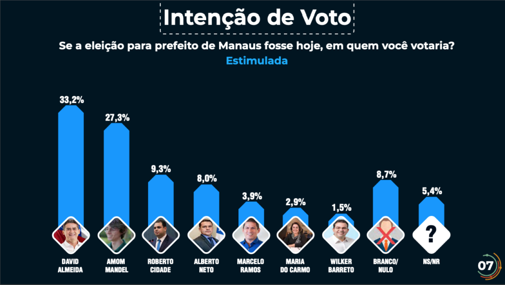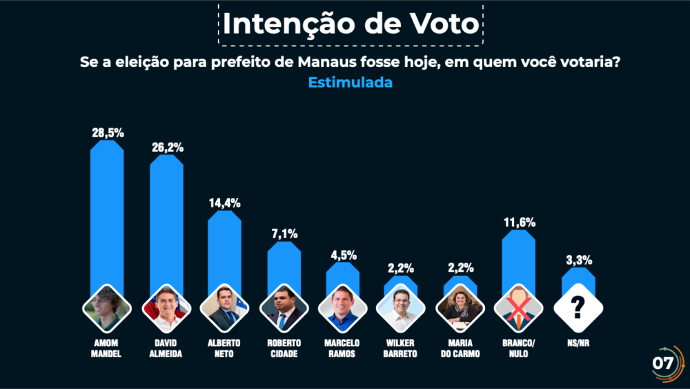 No topo da pesquisa, o prefeito de Manaus David Almeida (Avante) obteve 33,2% das intenções de voto, um aumento em relação aos 26,2% anteriores. Já o deputado federal Amom Mandel (Cidadania) viu suas intenções de voto diminuírem de 28,5% para 27,3%, sendo ultrapassado por David Almeida, que agora lidera a disputa com um crescimento de 7%, enquanto Amom Mandel sofreu uma redução de 1,2%.